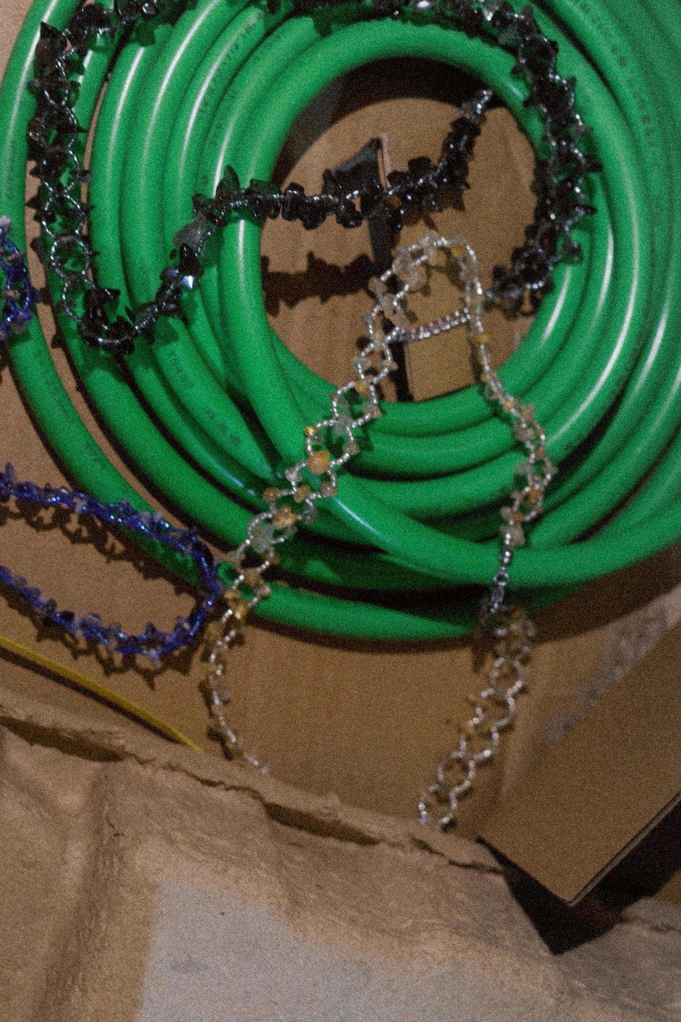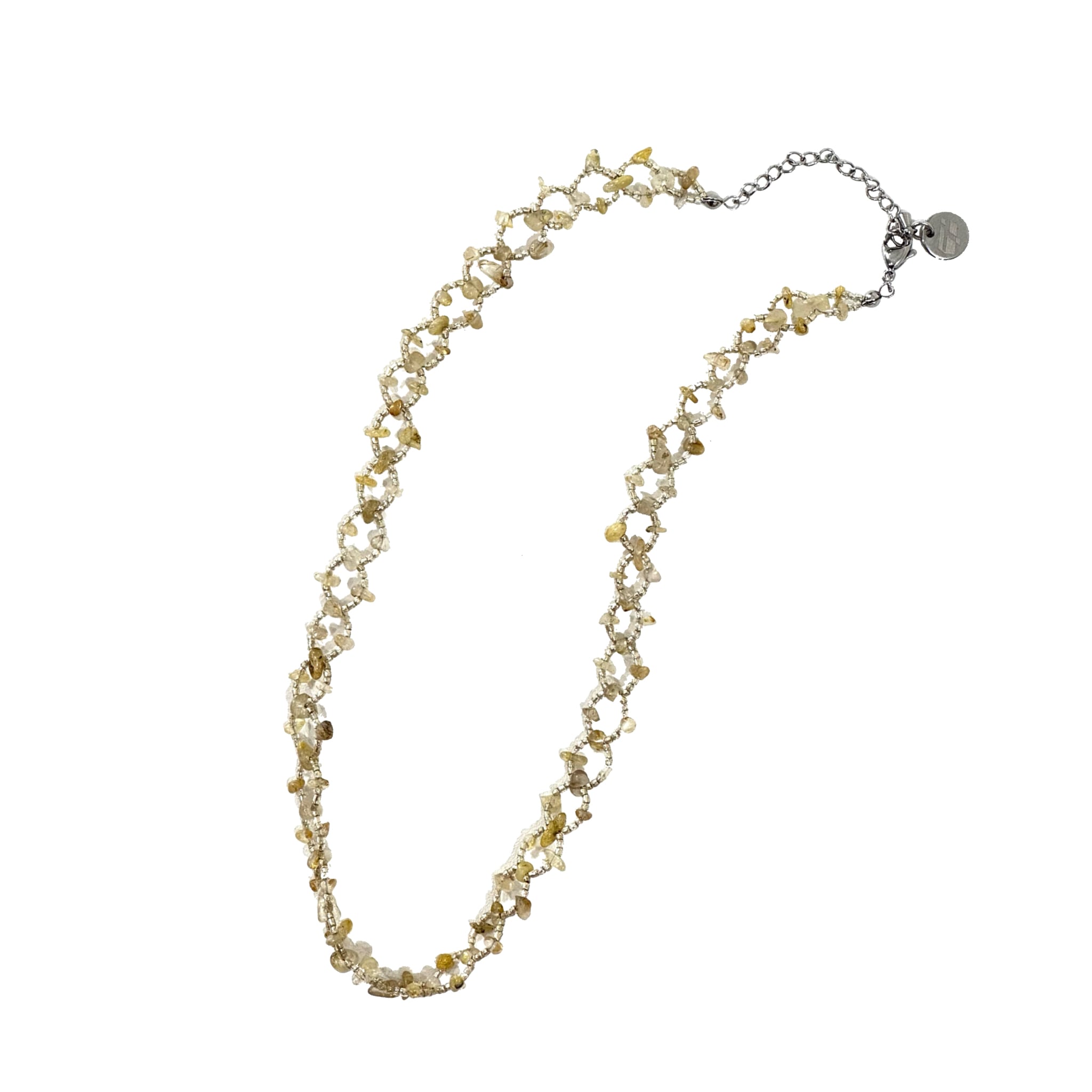 天然石チップとガラスカットビーズで制作しています。しなやかさとタフネスが同居するイメージです。