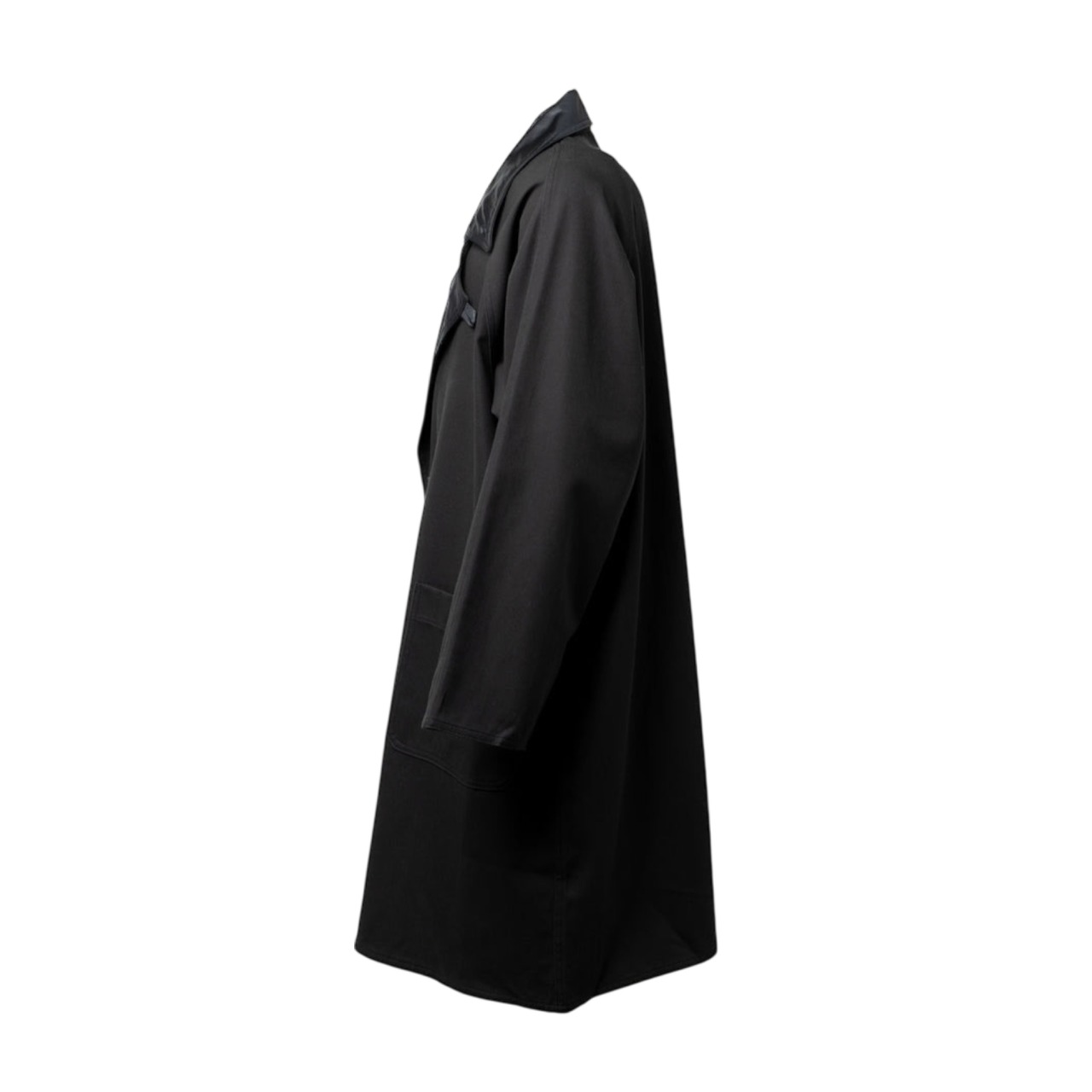 レザーを思わせるナイロン素材の襟を配し、ミニマルなデザインに奥行きとコントラストを添えています。